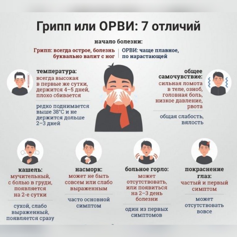 ОРВИ — общее название острых инфекционно-воспалительных заболеваний верхних дыхательных путей. В отличие от гриппа, который вызывают только вирусы гриппа, у ОРВИ более 200 возбудителей: пневмовирусы, парамиксовирусы, коронавирусы и др. ОРВИ может быть вызвано как одним из них, так и несколькими одновременно.