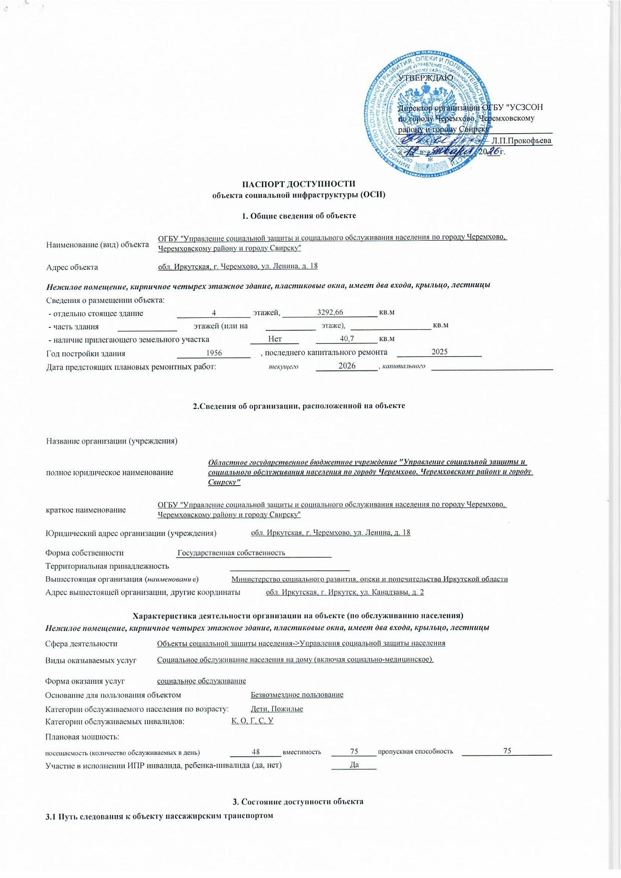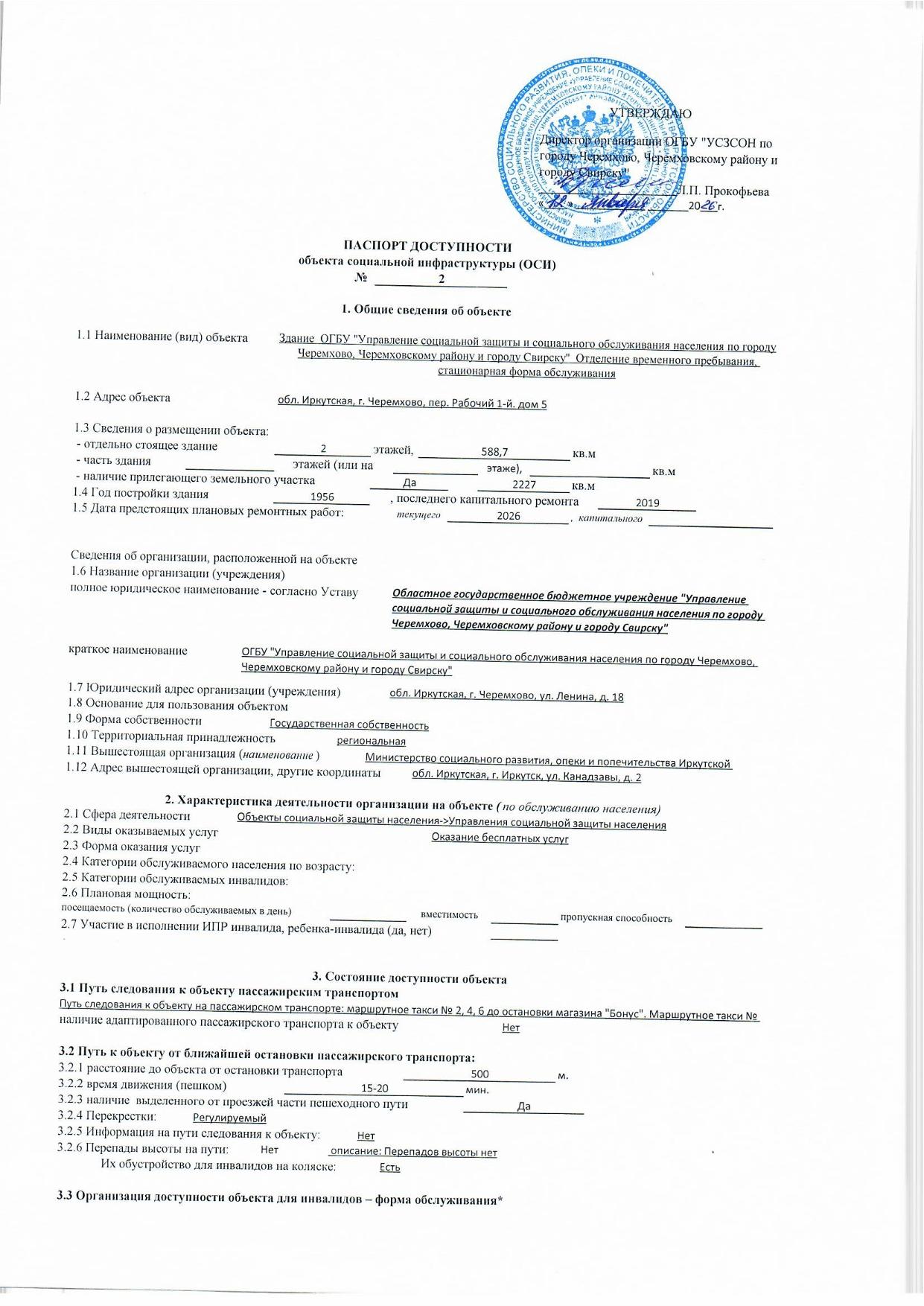 Паспорт доступности объекта социальной инфраструктуры Опубликовано 05.05.2016Обновлено на 06.02.2026от PresscenterРубрики:УправлениеПаспорт доступности ОСИ УСЗСОН по городу Черемхово, Черемховскому району и городу Свирск Паспорт доступности ОСИ Отделение временного пребывания План мероприятий по поэтапному приведению объектов на предмет доступности для инвалидов Presscenter
